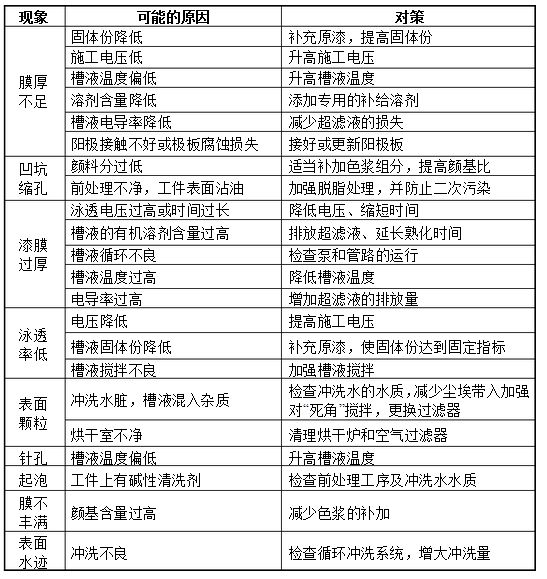 HED系列阴极电泳涂料在施工过程中,尽管在规定的工艺参数下实施监控和管理,但由于各种相关条件的影响,仍存在出现问题的可能性。为了方便用户的使用,我们特把易发生的问题,产生的原因及解决方法列表如下:#p#分页标题#e#